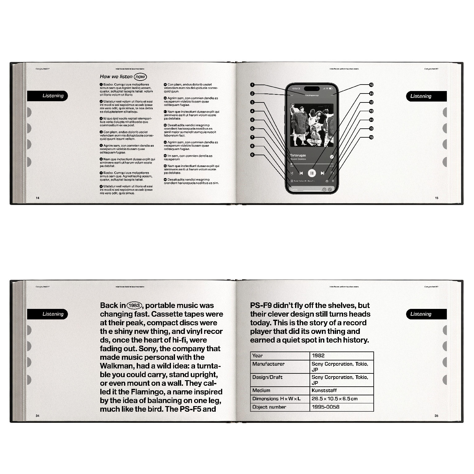 This is a fictional editorial publication exploring physical interfaces of consumer electronics before the rise of touchscreens. Based on selected objects from the Museum für Gestaltung Zürich collection, the project focuses on devices by Sony, Wega, Braun, and related designers from 1959–1987.